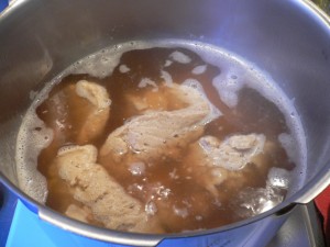 _Mettre les tranches (ou les cubes) de seitan dans une cocotte bien remplie d’eau, pensez bien que le seitan va doubler de volume pendant la cuisson: