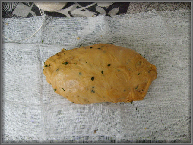 Après le pétrissage, presser un peu le seitan cru pour retirer l’air et lui donner une forme de rouleau.