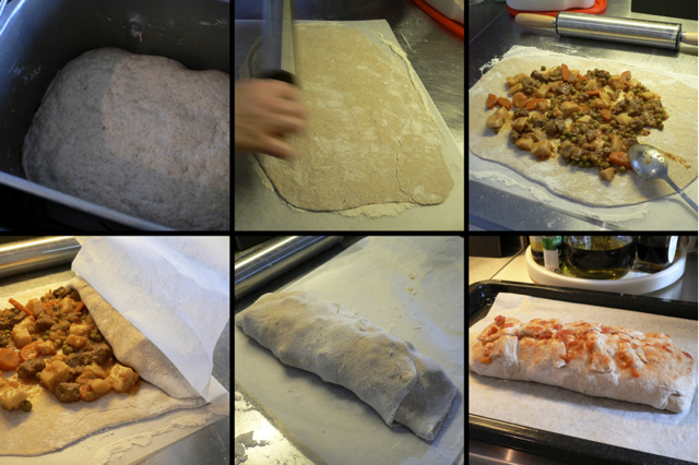 _Etaler la pâte au rouleau assez fine, mais pas trop sinon après on risque de la casser pendant l’enroulement; pour me faciliter la vie j’ai fariné du papier sulfurisé et j’ai étalé ma pâte là dessus; sur la pâte j’ai bien distribué mes restes, en faisant attention à ne pas arriver trop près du bord et en m’aidant avec le papier j’ai commencé à enrouler la pâte sur elle même: un peu comme si on faisait des makis japonais. Terminé de tourner j’ai fermé le rouleau, j’ai coupé les extrémités à droite et à gauche et avec les chutes j’ai un peu “décoré” le dessus. Avec un pinceau en silicone j’ai bien nappé avec la sauce tomate: