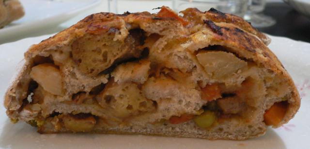 J’ai préparé ce rouleau avant de partir pour terminer un reste de seitan à la mode et je voulais reproduire la façon de faire la pizza que j’ai vu dans une pizzeria de ma ville en Italie, en réalité, comme dans toutes les pizzas, à l’intérieur on peut mettre ce qu’on veut (tous les restes quoi! ;-))