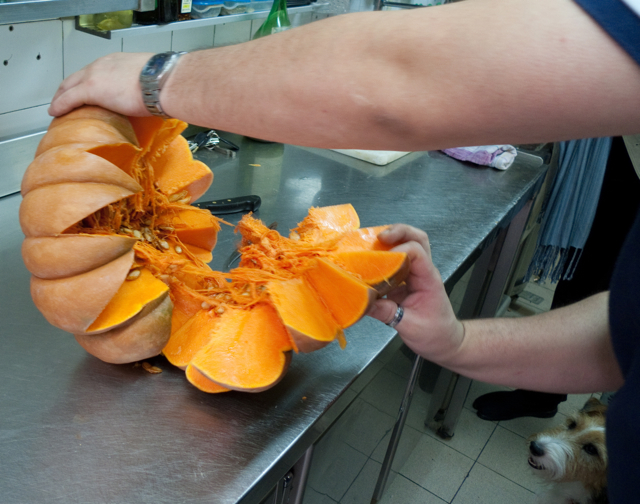 Cette opération a été assez longue (environ 20 minutes), la courge était bien épaisse, donc Francesco a travaillé avec patience mais énergiquement, il utilisait deux couteaux, un petit (office) Victorinox et un… long couteau à pain:
