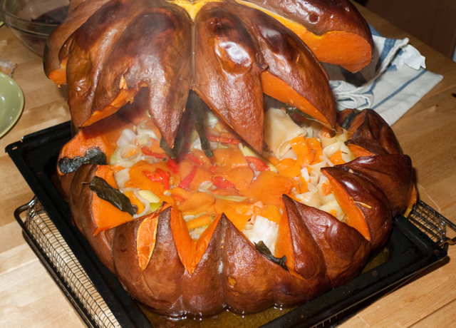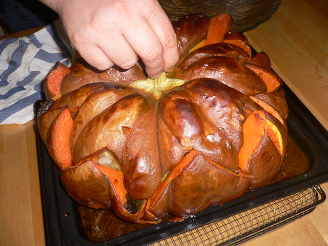 La cuisson est faite au four à 170° pour environ deux heures (ça dépends de dimension du potiron, de temps en temps il vous faudra la tester avec une longue brochette), Francesco il avait démarré la cuisson à 150°, puis il a augmenté à 170°. Il faut faire attention à la cuisson, si le potiron est trop cuit le “couvercle” se défait, s’il n’est pas assez cuit il reste trop dur par endroits, l’idéal serait de le tourner dans le four, pendant la cuisson, d’un quart de tour de temps en temps, et de tester bien à plusieurs endroits avec la brochette.