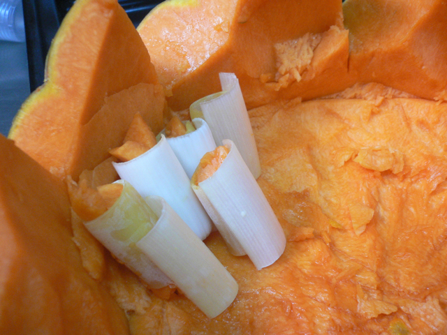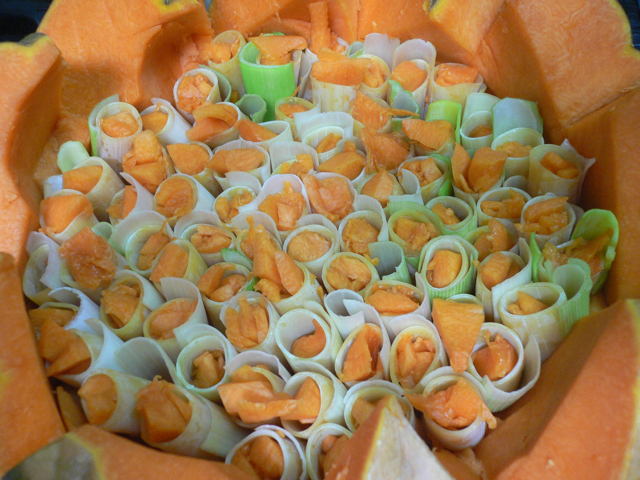 Graver la pulpe du couvercle dans les deux sens et saler, fermer la courge à l’aide du marquage fait au début, avec les restes on fera un autre plat… rien se gaspille… ?