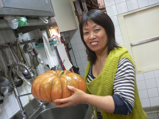 Nous aussi on a fait quelque chose entretemps: nous avons aidé Loulou à terminer l’apéro qu’elle nous avait gentiment préparé, du vin avec les pêches (une éternité que je ne buvais pas ça: qu’il est bon!), le tout surveillé par un porte-bonheur chinois qui devait être viré et que nous avons sauvé de la poubelle:Une fois ouverte, la courge a été nettoyée des pépins (que Loulou a lavé et réserver pour les faire sécher et sauter à la poêle), une partie de la pulpe aussi a été enlevée parce-qu’elle servira ensuite.