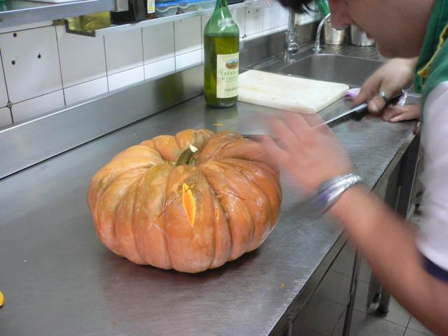 Voici le potiron cuit quand nous l’avons ouvert, c’était très beau et très bon, les pâtes était bien cuites et le parfum… mmmh! Francesco s’est dépassé cette fois-ci aussi! Une préparation comme celle-ci est parfaite pour un dîner entre amis, c’est très convivial, mais il faut bien s’organiser avec les temps!