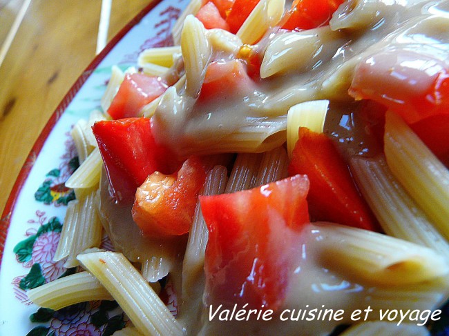 Nous avons utilisé ce fromage fondu cette fois-ci d’une manière très simple : c’est la recette de mon fils Vitali -4 ans- qui a eu envie de sortir d’un quasi-jeûne de plus de deux jours (because sorte de gastro) en me voyant faire ce fromage fondu ! Il a goûté, a approuvé, et m’a alors « commandé » « des pâtes, avec des dés de tomates et du fromage fondu » ! Je me suis aussitôt exécutée, et tout le monde s’est régalé !
