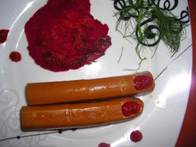 Les doigts sont des très bonnes saucisses de tofu avec verni à l’harissa (mais à l’enfant j’ai donné de la mayonnaise vegan pour qu’elle ne s’étouffe pas!) le poumon est un veg-burger de seitan, pomme de terre à la vapeur et beaucoup de betterave rouge sauté à la poêle et mixé tout ensemble. Le résultat final est un peu moche, mais peut-être que ça peut vous être utile comme idée pour Halloween.