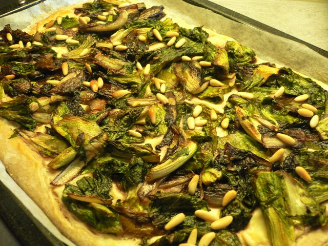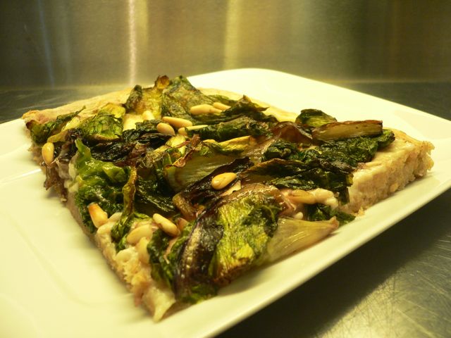 _Etaler la pâte sur du papier sulfurisé, sur la pâte bien distribuer le stracchino vegan, puis les salades cuites, parsemer de pignons et cuire au four à 200° environ 20 minutes, ou plus, jusqu’à ce que les bords seront dorés.