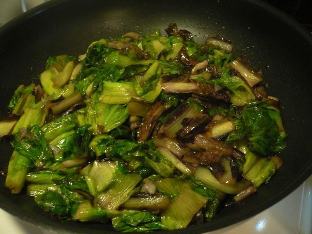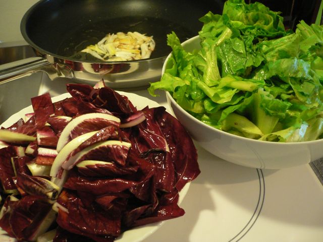 les feuilles de salade amère lavées et coupées en deux ou trois