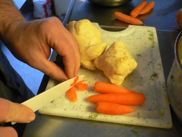 Découpez en petit dès tous les ingrédients du soffritto et cuisez-les dans une sauteuse avec de l’huile de colza, entre temps nettoyez les topinambour à l’aide d’un économe et d’un couteau de service et coupez les en “lames” régulières de deux millimètres d’épaisseur, épluchez les petites carotte de manière de conserver leur forme… mignonne ? , vous ajouterez ces légumes au soffritto seulement quand ce dernier sera bien cuit.