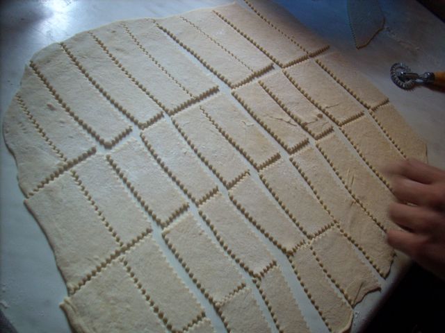 Mélangez tous les ingrédients, travaillez l’appareil pour environ vingt minutes. Abaissez la pâte le plus finement possible.
