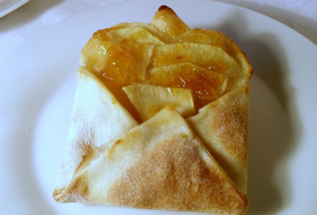 Couper très finement un quartier de pomme, disposer les tranches sur la partie découverte du coeur. Fermer les enveloppes. Etaler une fine couche de confiture sur les pommes: elles se figeront et ne noirciront pas.
