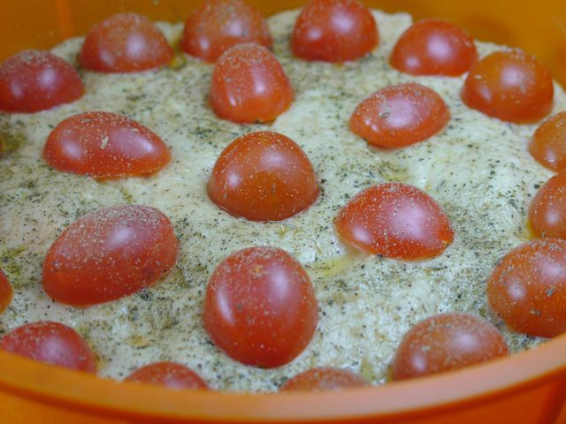 Après une heure travaillez la pâte encore un peu et placez-la dans un moule huilé (d’environ 25-30 cm de diamètre pas plus sinon ça ne sera pas assez épaisse et moelleuse), étalez la pâte avec les mains (pour faire ça il est mieux si vous vous huilez les mains, ainsi la pâte qui est très collante ne collera pas!), enfoncez les câpres dans la pâte (je les ai disposés à distance régulière et en rond pour en mettre un peu partout) où vous avez mis les câpres pincez la pâte pour la fermer à nouveau, disposez les tomates cerise coupées à moitié, pressez-les bien dans la pâte et badigeonnez d’huile avec un pinceau en silicone. Sur ça parsemez deux belles pincées: une de origan sec et une de romarin séché et réduit en poudre. Ces aromates on peut aussi les mélanger aux farines avant pour avoir une fougasse parfumée à l’intérieur.