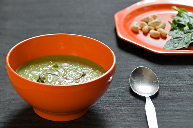 Chauffer une grande casserole pour le bouillon. Parsemer sur le fond une pincée de sel et chauffer pendant une minute. Ensuite ajouter l’huile et chauffer encore trente secondes, sans le bruler. Ajouter les asperges, le céleri et l’oignon, sauter pour environ 6-10 minutes, jusqu’à ce que le céleri soit tendre. Verser le bouillon végétal dans la casserole, ajouter la feuille de laurier, porter à ébullition et cuire à feu bas pour trente minutes. Ajouter la crème de noix de cajou et cuire encore dix minutes. Retirer le laurier, régler de sel et poivre. Mixer le tout. Ajouter les feuilles d’épinard crues et mixer encore jusqu’à avoir une crème mousseuse.