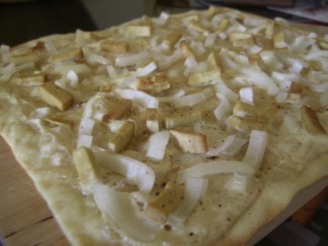 Le tofu fumé remplace ici les lardons traditionnellement utilisés dans l’élaboration de flammekueche. Vous pouvez aussi utiliser des saucisses de soja découpées en allumettes si vous préférez. De plus, la pâte à flammekueche peut être remplacée par une pâte à pizza finement déroulée.