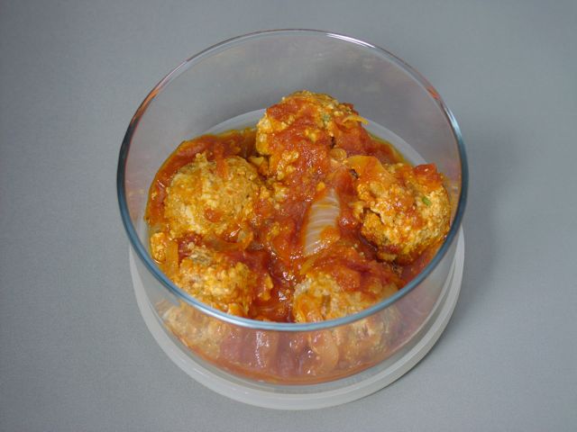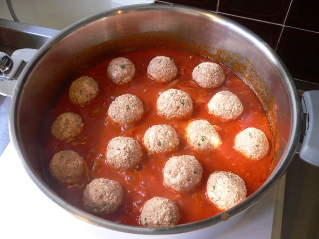 J’ai mis la plupart des boulettes dans la sauce tomate et je les ai faites cuire cinq minutes à feu moyen-bas, après je les ai retournées très doucement à l’aide de deux fourchettes, c’est assez tendre, donc il faut faire attention, et j’ai laissé mijoter encore deux ou trois minutes: