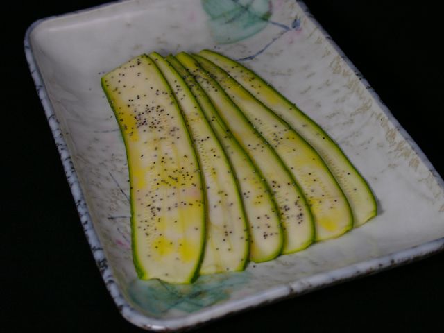 Trancher à la mandoline les courgettes le plus finement possible et les disposer à plat dans une jolie assiette, si possible sombre pour les faire ressortir.