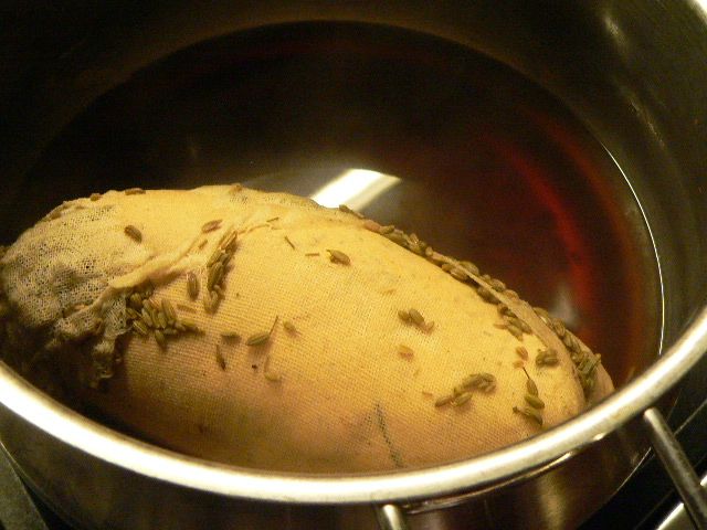 Lier les extrémités du rouleau avec de la ficelle pour la cuisine et le mettre dans le fait tout avec les ingrédients pour le bouillon et laisser bouillir une heure: