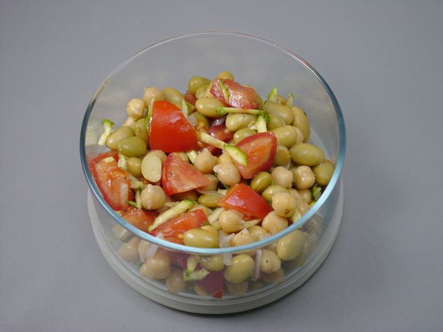 Si vous voulez vous pouvez cuire vos légumineuses, sinon, si comme moi vous êtes pris par un attaque de rien-faire, vous ouvrez vos pots et vous les mélangerez avec l’oignon coupé fin, la courgette râpée avec une râpe à gros trous, et les tomates coupées en cubes. Cette salade est meilleure si préparée la veille, bien assaisonnée et laissée reposer au frigo une nuit.