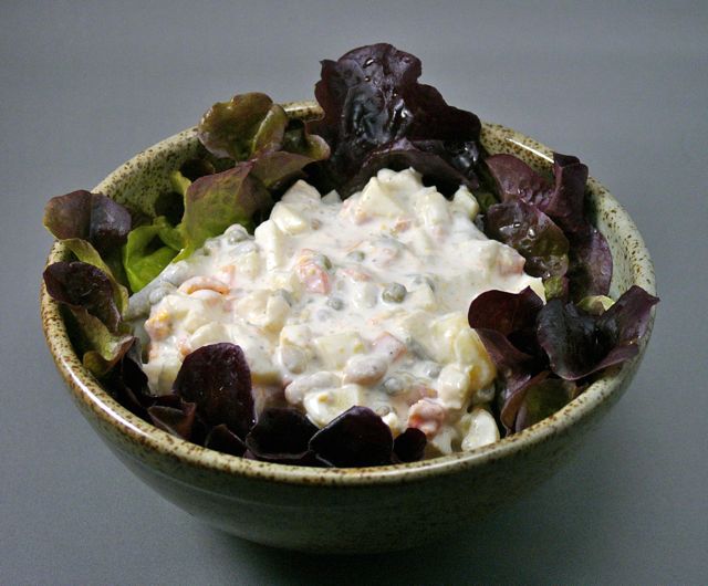 Couper tous les légumes en petits cubes et les cornichons en rondelles, faites attention à la cuisson, les légumes ne devront pas être trop cuits, et les assaisonner avec la mayonnaise diluée avec le jus de citron, le poivre et l’écorce de citron, le fait de mettre le jus de citron rend la mayonnaise plus liquide, de cette façon on peut mieux l’amalgamer aux légumes et on en mettra moins aussi. Dresser dans un bol chemisé avec la salade (ça fait quand même plus jolie et à la fin vous aurez vos feuilles de salade déjà assaisonnées avec la mayo). Réserver au frigo et servir frais avec une belle salade de tomates ou une salade verte. Si vous en faites une bonne quantité vous pourrez la savourer les jours d’après, parce-que ça ne craint pas comme les sauces à base d’oeuf!!! Conserver au frigo.