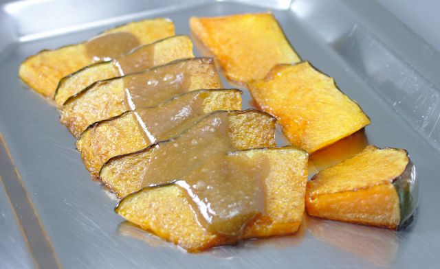Pendant la cuisson préparer la sauce : mélanger tahin, mirin, sauce soja, saké dans un bol et avec ça napper les tranches de courge encore chaudes.