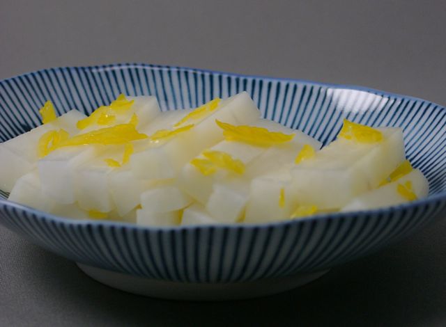 Épluchez et couper le daikon en bâtonnets. Avec un petit couteau bien affilé enlevez le zeste du yuzu et coupez-la en petits morceaux.
