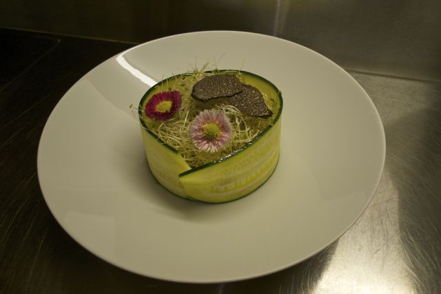 D’une belle et longue courgette sortir deux tranches régulières et fines. Mettre les tranches de courgette crue à plat dans une assiette et les enduire de chaque côté d’huile à la truffe, couvrir et réserver jusqu’au moment de l’utilisation.