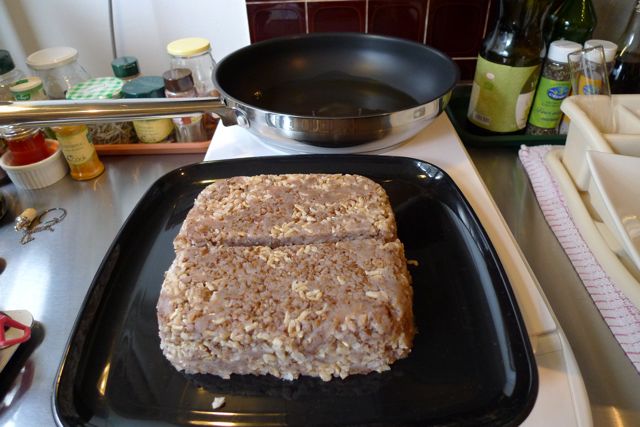 Une fois la “brique” formée on pourra la découper en tranches et la frire dans un peu d’huile de sésame, trois minutes de chaque côte pour former une petite croute croustillante.