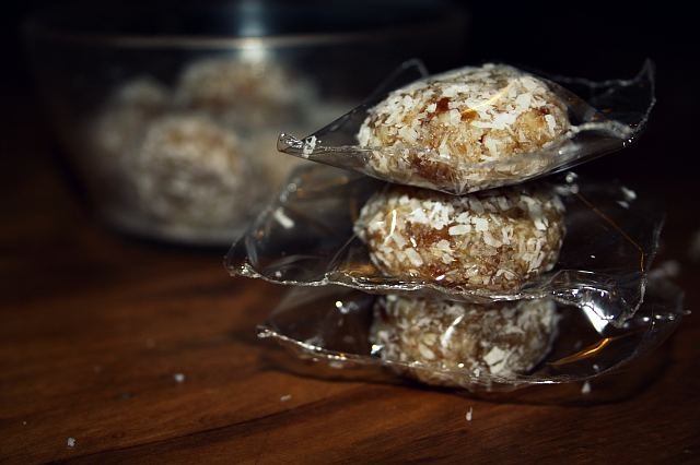 J’ai fait au pif, mais j’ai mis environ 15 amandes, 7-8 dattes et une cuillère à soupe de coco râpé… La préparation est très simple: broyer les dattes avec les amandes, ajouter le coco et en dernier le malt et continuer à broyer pendant deux minutes. Prendre une petite partie de l’appareil et en faire des boulettes à enrouler dans le coco râpé, presser un peu au centre pour les aplatir. Terminé!