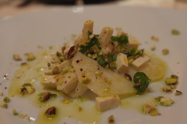 Concassez les pistaches et hachez les feuilles de basilic. Mondez la poire et coupez-le en fines tranches.