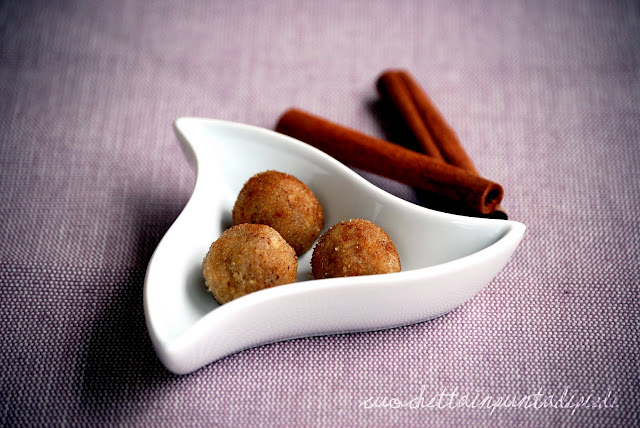 Broyer 25 gr de flocons d’avoine (1/4 de cup) dans le mixer, jusqu’à obtenir presque une farine. Ajouter les noix du Brésil et broyer encore pour faire sortir l’huile des noix et faire compacter un peu l’appareil. Au début ça ressemble à une farine et après ça se colore et se compacte un peu changeant de texture. Transfere l’appareil dans un saladier, ajouter les autres 45 gr de flocons (1/4 de cup), le sirop d’agave et l’huile de coco ramollie. Bien mélanger et former des boulettes à passer, une par une, dans un mélange de sucre et cannelle, réserver au frigo.