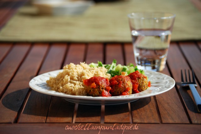 Je vous préviens: pour faire les boulettes vos mains sentiront l’oignon mais ça en vaut le coup! Je les ai servie avec une simple sauce tomate, accompagnée de cous cous complèt et salade de céleri, le plat est seulement pour faire la photo, en réalité c’est la moitié de ma portion. Je vous conseille de ne les servir pas complètement trempées dans la sauce sinon vous risquez qui s’effritent. La meilleur des choses pour les réchauffer c’est de les passer au four, aussi la fonction “crisp” du micro-ondes pourrait marcher mais je ne l’ai pas donc je n’ai pas pu essayer. Si vous voulez les accompagner avec une sauce vous pouvez la servir à part dans un petit bol ou la verser directement sur les boulettes peu avant de les porter à table.