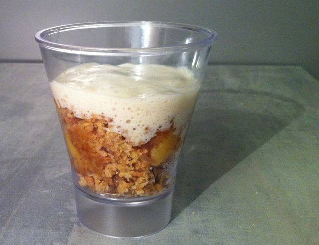 Remplir chaque verrine de crumble jusqu’aux 2/3 environ, puis ajouter une couche de crème à la vanille.