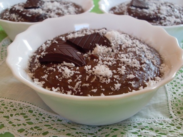 Disposer pour terminer 2 morceaux de chocolat dans la crème et saupoudrer de noix de coco.