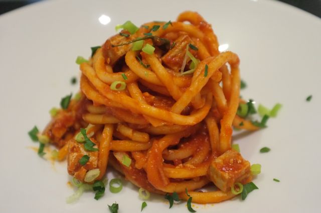 Ces pâtes prévoient les lardons, que je n’ai jamais tellement aimé… donc… rien de plus facile de les faire vegan pour, finalement, me régaler! C’était aussi une des recettes de mon dernier cours de cuisine: “Les sauces pour les pâtes”.