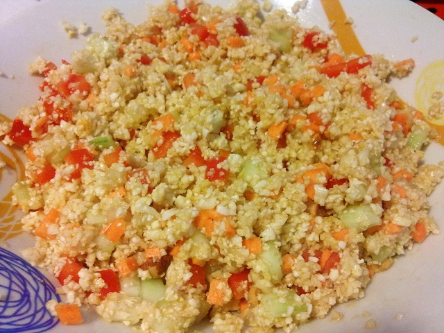 Dans un robot hacher le chou fleur pour en faire le “raw cous-cous”. Assaisonner avec un filet d’huile, citron, sauce de soja (perso j’en met pas mal), une pincée de curry et une bonne dose de curcuma. Laissez les saveurs se mélanger. Couper en petits cubes les légumes, broyer les noisettes et ajouter tout au “cous-cous”. Servir frais, si on veut aussi avec des tomates cerise, qu’au moment je n’avais pas.