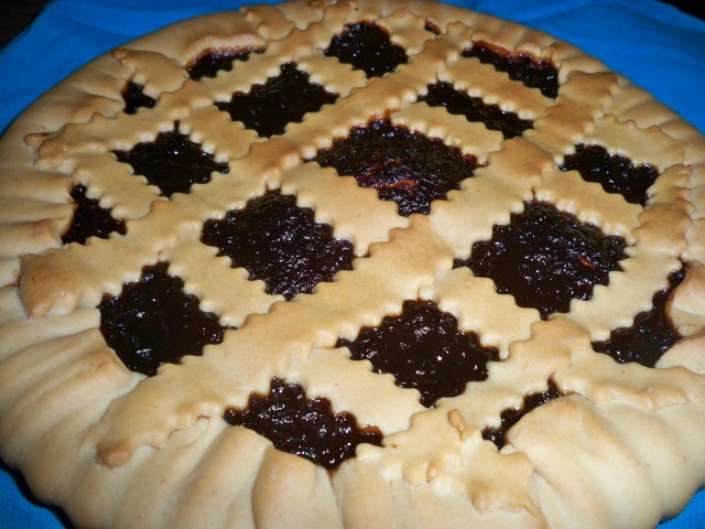 Huiler et fariner un moule, étaler la pâte au rouleau à pâtisserie, foncer la pâte dans le moule et couvrir de confiture, décorez de façon classique avec l’excédent de pâte, ou suivant votre fantasie.