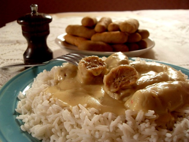 Dans une casserole et sur feu doux, faire fondre le cube de bouillon de légumes dans la crème de riz avec l’huile d’olive et la moutarde. Mélanger. Dans un grand saladier, mixer les haricots blancs égouttés avec le bouillon de légumes à la crème. Ajouter le gluten, la poudre de noix de cajou, l’échalote en semoule, le sel et le poivre. Mélanger bien tous les ingrédients afin d’obtenir une pâte parfaitement homogène. Couvrir une plaque de cuisson de papier sulfurisé. Préchauffer le four 10 mn à 180°. Façonner à la main des mini saucisses. Déposer les mini saucisses sur la plaque de cuisson et enfourner 45 mn à 180°. Les retourner à mi-cuisson. Servir chaud avec du riz et une sauce blanche. Dans une casserole et sur feu doux, faire fondre le cube de bouillon de légumes dans la crème de riz. Réserver. Dans une seconde casserole, mélanger l’huile d’olive avec la farine jusqu’à ce qu’une pâte se forme. Cuire sur feu doux quelques minutes sans cesser de fouetter. Ajouter le bouillon de légumes à la crème, le sel, le poivre, la moutarde, augmenter le feu (moyen) et mélanger à l’aide d’un fouet à main jusqu’à épaississement (ne pas la faire trop épaisse). Réduite le feu (doux), ajouter les mini saucisses, mélanger et laisser 2 minutes tout en mélangeant.
